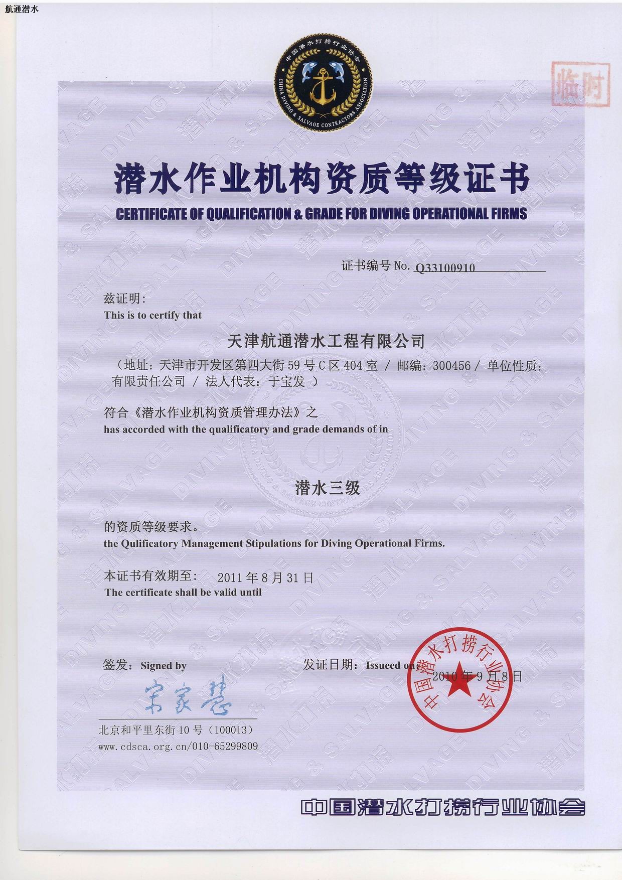 我公司被评为中国潜水打捞行业协会理事单位,并成功申请潜水作业三级资质。
