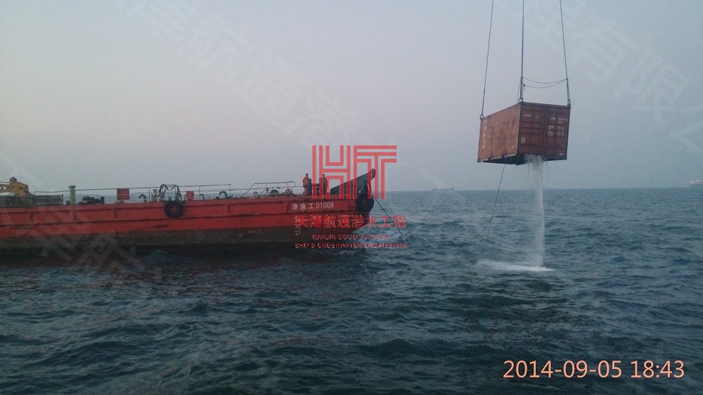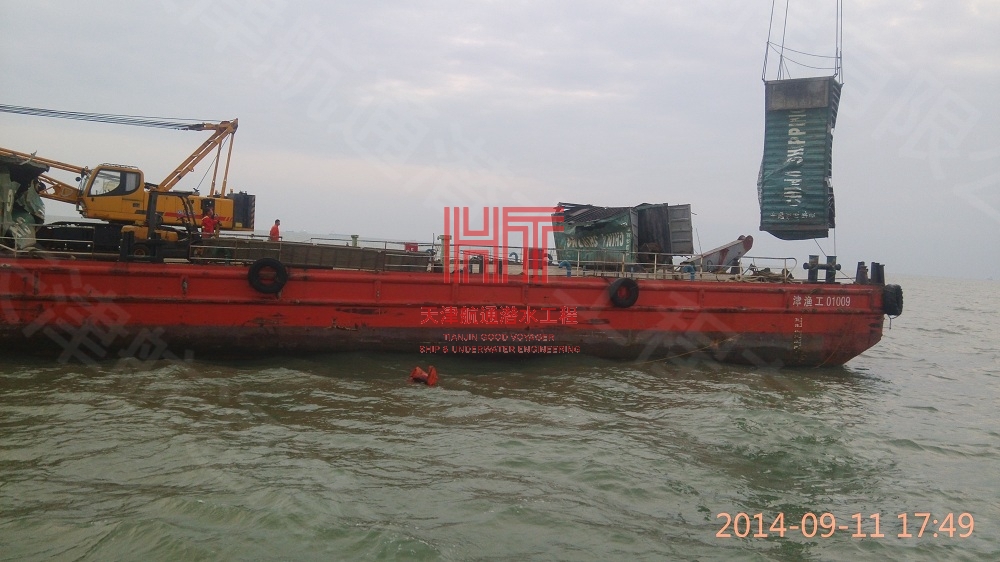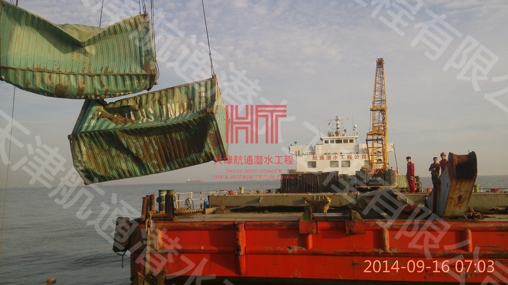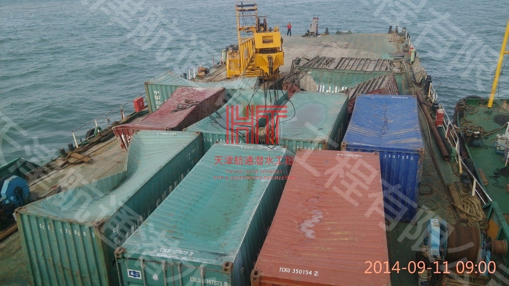 我司自接到相关部门应急打捞清障任务后于2014年9月5日上午应急派遣150T浮吊(秦航工206)、3000T甲板驳(津渔工01009)、潜水工作船津航交一、定位工作船(儒捷1号)各一艘赶往事故水域开始进行紧张有序的定位、探摸、打捞集装箱作业,截止9月11日夜连续7个昼夜工作打捞出水集装箱12个。