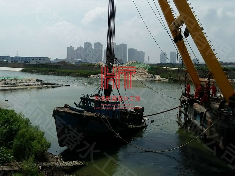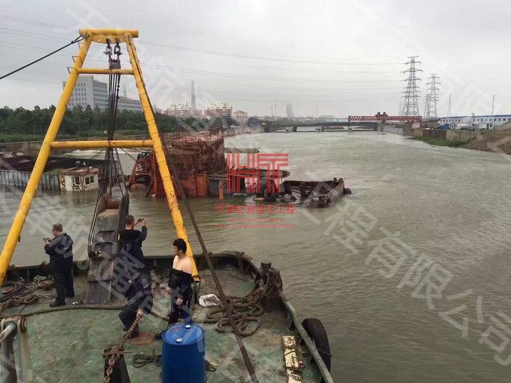 7月24日在海河海事局召开的协调会上得到相关部门指示,要求会后立即调集作业船舶进场,开展打捞工作,我单位保证在10内将两艘沉船清理移出至安全区域。24晚200T浮吊调遣进入海河并连夜定位,开始作业准备。由于水流过急,无法贴靠距围堰口最近的 “津航工3” 坐浅沉船,且“津航工3”船体较大,重量超出200T浮吊荷载范围。遂先对其西侧另一艘无名坐浅船实施水下过扣,舱内开孔下泵准备工作。