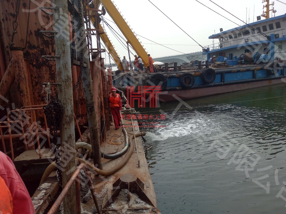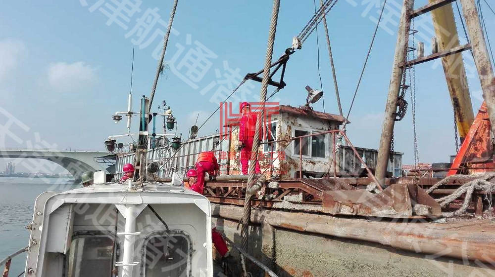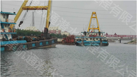 首先,为确保打捞期间遇大暴雨时入水渠口水流无限增大对沉船冲击造成位移飘流破坏的隐患,由200T、500T大型浮吊分别大角度远距离下锚定位,由两船引出3根φ100粗缆与沉船主桩连接绞紧,并在7.27-8.2日间由作业船及人员配合,按部就班24小时施工对沉船舱内余留的大量沙石料不断进行清理,透气孔、风帽进行水上水下封堵,舱内摸排检查,放置大小不同的抽水泵,并对承重起吊点位进行加固,船底水下过扣等起浮拖移前的准备工作。至8月3日上午,全部的预计工作已顺利完成,8月3日下午在现场统一指挥下,作业人员开始将下入“津航工3”各舱室内的大小水泵开启同步抽水,“成功9”(200T)、成功11(500T)同时缓慢绞紧各系固粗缆,防止其起浮后发生位移危险,并随着排水助浮后逐渐发力,慢慢绞离围堰口至水深区域,并由工作船及潜水员、辅助人员配合将两根吊缆固定于沉船等分部位吊钩锁止。因天黑能见度有限,出于安全考虑在确保现场作业安全后,当日工作停止。