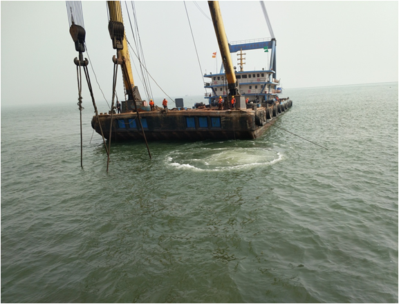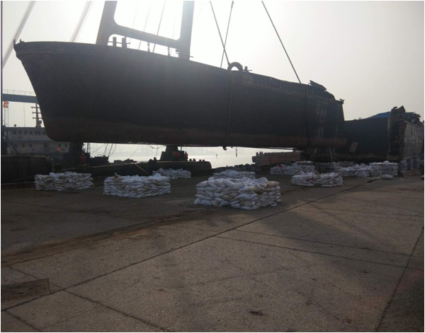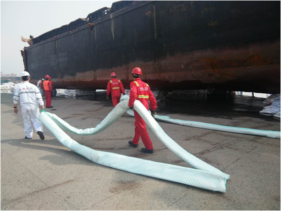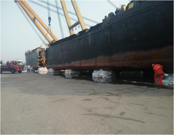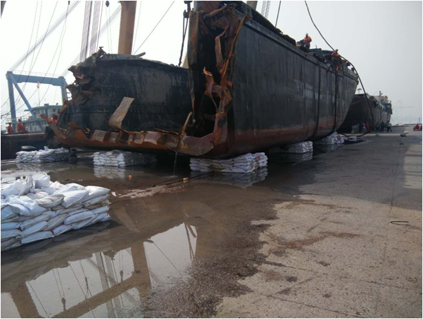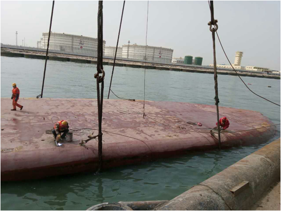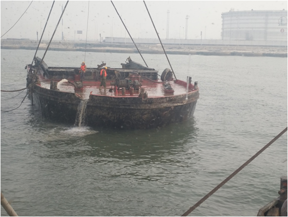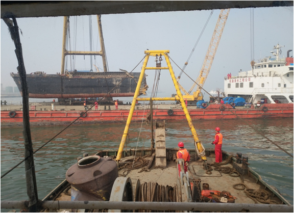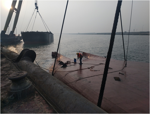 沉船吊装上岸后布控拖油缆