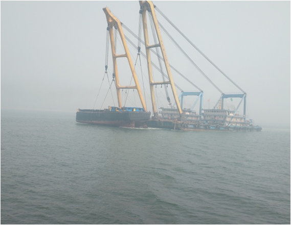 两艘浮吊共同起吊舯后部上岸